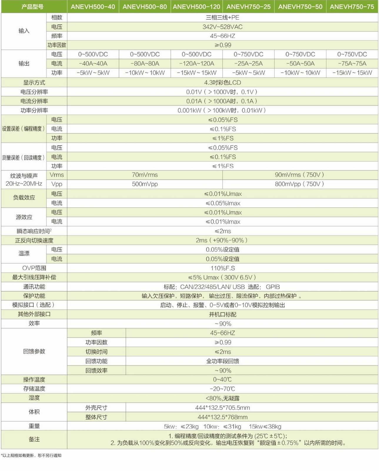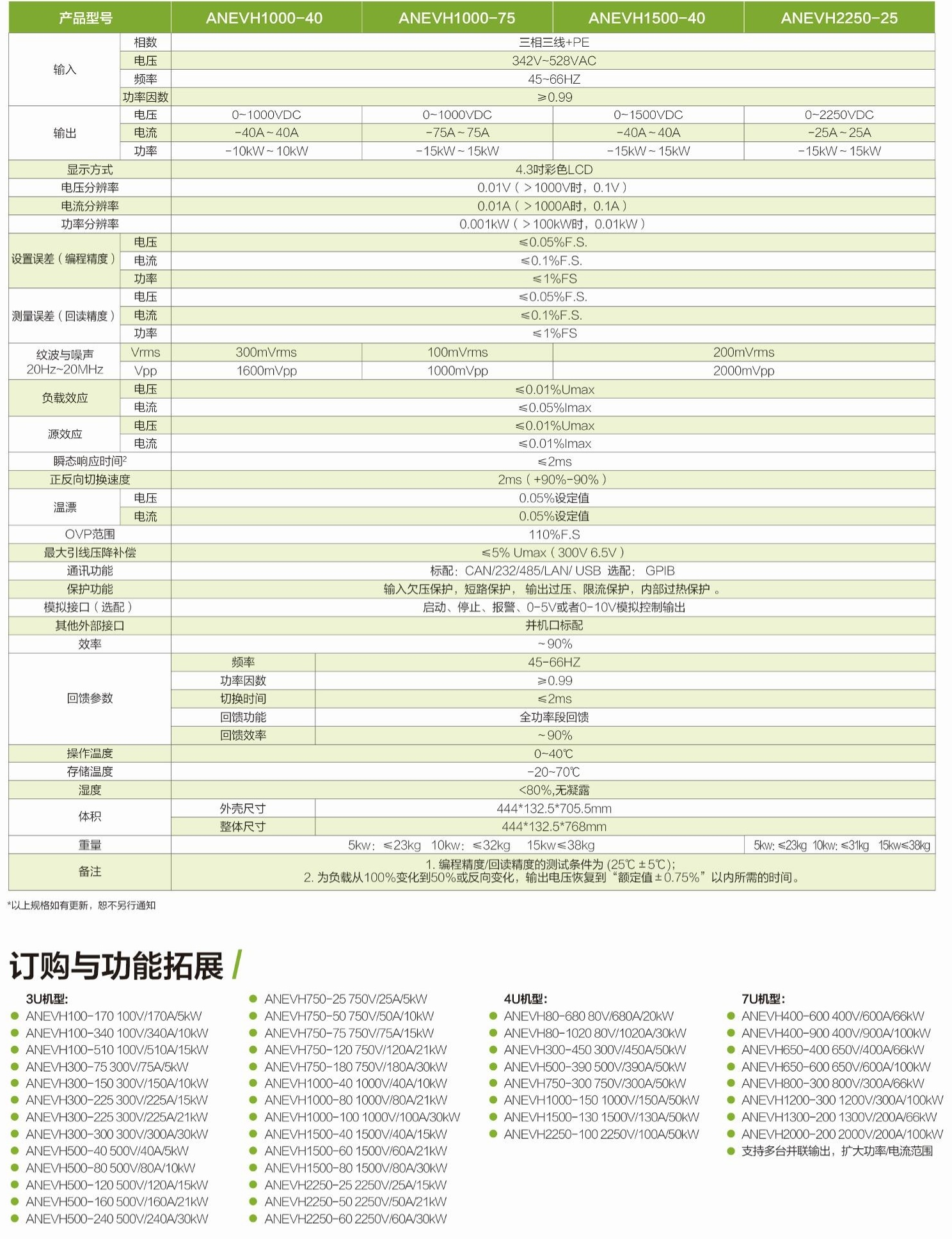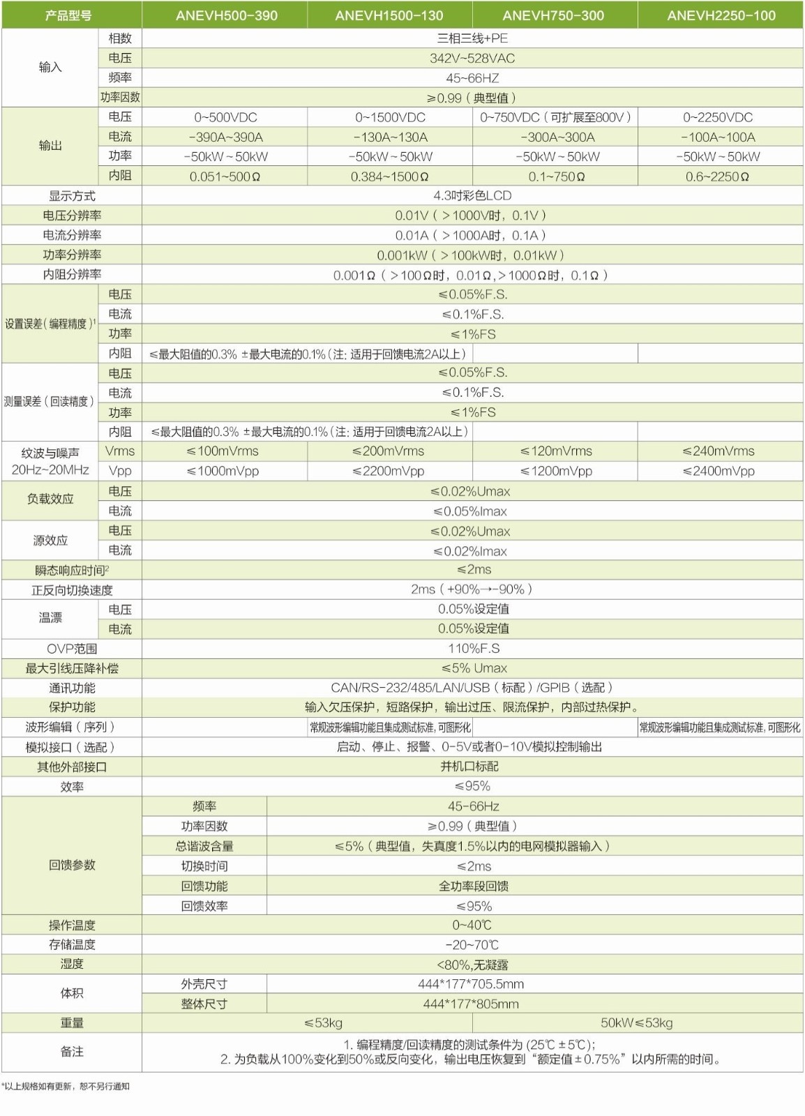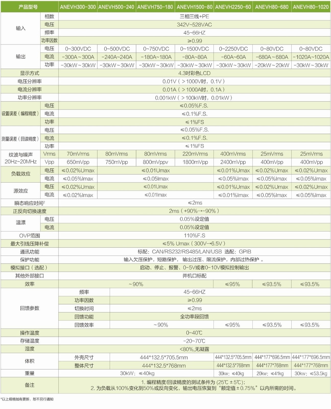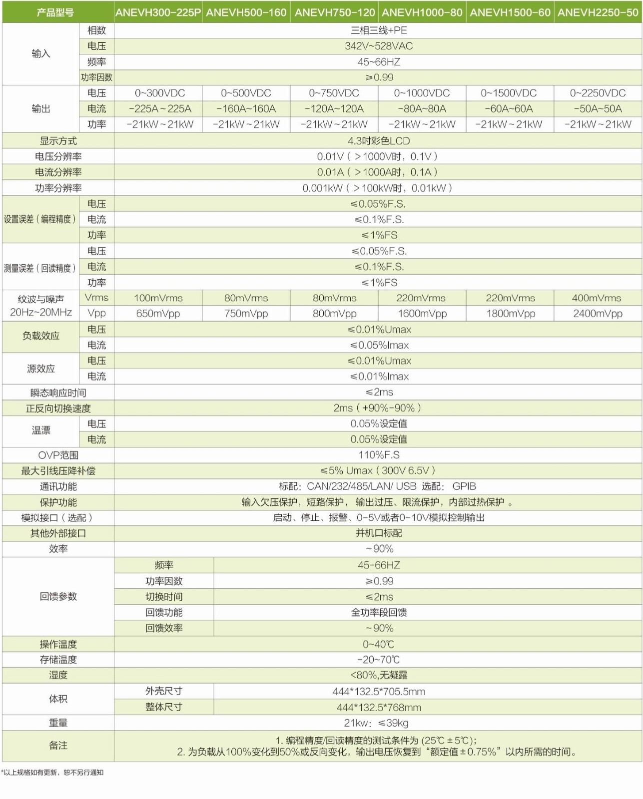 ANEVH系列双向可编程直流测试电源全系列7个电压等级,电压等级分布覆盖0V-2250V,支持多台并机,功率可扩展至1MW。能量双向流动,自动无缝切换,高功率密度,快速动态响应特性,内置函数发生器和标准测试曲线,可以自由产生多种波形,优异的特性和丰富的测试功能。适用于实验室、汽车电子、新能源三电、微电网、大功率测试等多种测试场合。