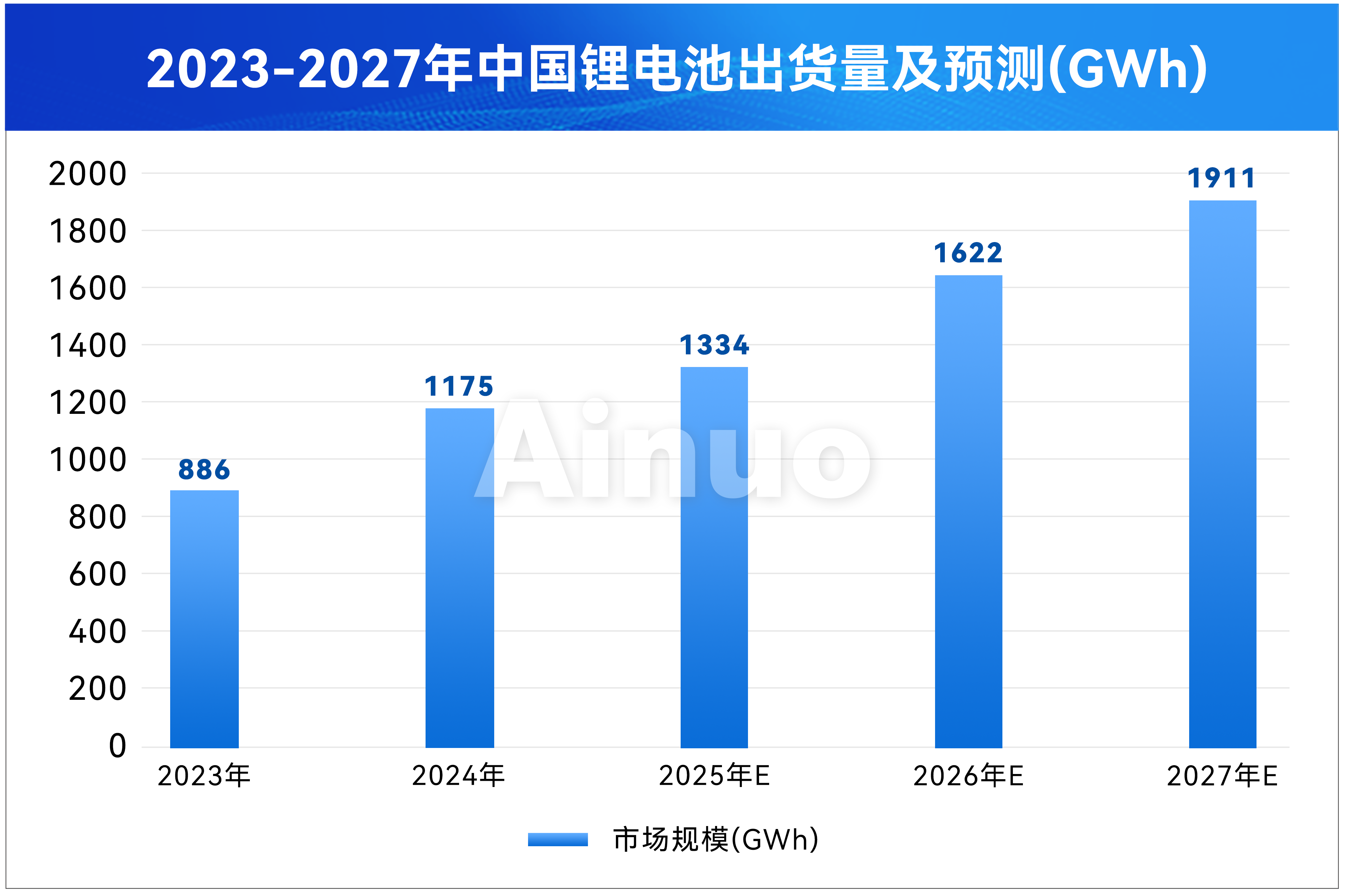 在电动汽车、储能领域的需求驱动下,我国锂电池产业保持增长态势。根据GGII数据显示,2024年我国锂电池出货量为1175GWh,同比增长32.6%,预计2027年出货量将超过1911GWh,年复合增长率达 21.2%。